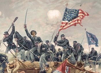 The other two divisions were commanded by Brig. Gen. James Pettigrew and Maj. Gen Isaac Trimble. The Confederates broke through the Union line along a stone wall, known as “the angle” before they were driven back with heavy casualties. “Pickett’s Charge” had failed and the battle ended. Lee and his Confederate army retreated to Virginia. This artist’s depiction of “Pickett’s Charge” is looking southwest from Cemetery Ridge. It shows Union General Winfield Scott Hancock directing the defense of the Confederate charge.